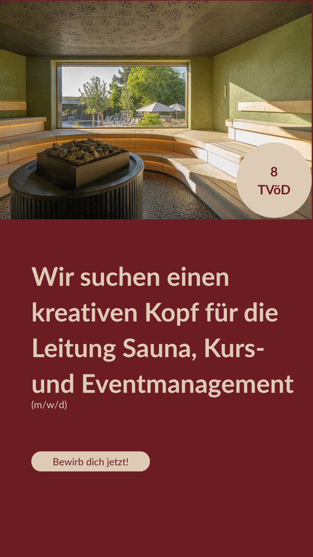 Mit unserem Bäderteam betreiben wir das Winnender WUNNEBAD mit seinem Freibad, Hallenbad und dem Sauna- und Wellnessbereich mit jährlich über 260.000 Besuchern sowie das Mineralfreibad im Ortsteil Höfen. Unsere Bäder modernisieren und entwickeln wir kontinuierlich weiter und freuen uns, wenn auch du Teil unseres Teams werden würdest.